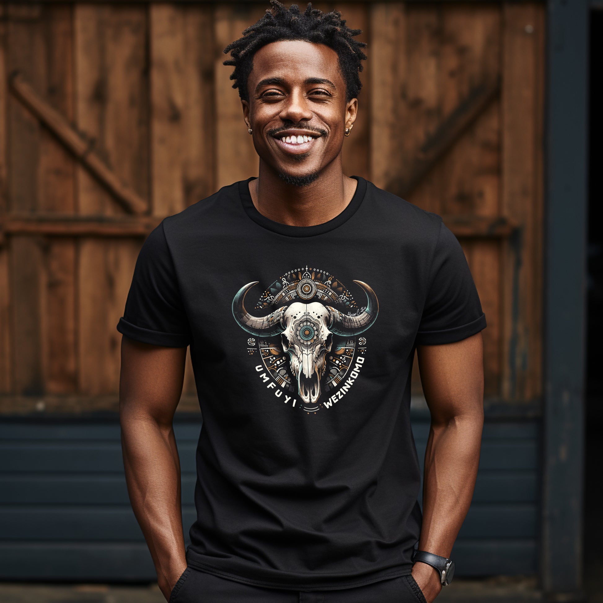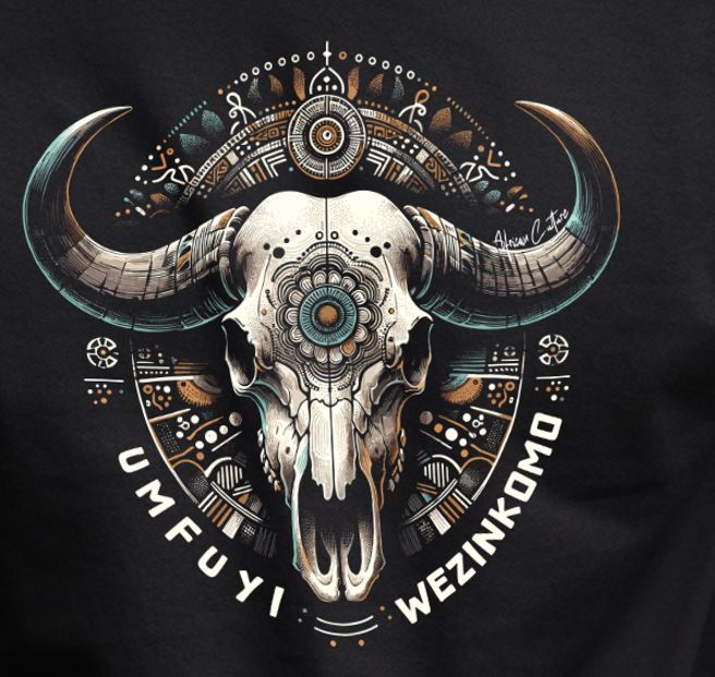 Ancestor’s Seal is a deeply spiritual design that merges mysticism, culture, and reverence. The central Nguni skull is adorned with ornamental detailing and encircled by sacred tribal symbols — echoing rituals, storytelling, and ancestral presence. A visual invocation of power, protection, and connection to the past, crafted for those who wear their lineage like armor.