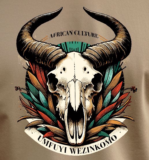 A majestic fusion of life and legacy — Crowned by Nature features a bold Nguni skull framed by vibrant native foliage, symbolizing the eternal link between land, spirit, and survival. Its curved horns and botanical wreath evoke ancient wisdom and sacred power, making this shirt a statement of reverence for African roots and resilience.
