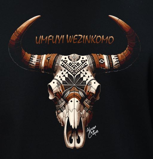 Echo of the Ancients is a bold tribute to heritage carved in bone. Featuring a beautifully detailed Nguni skull wrapped in geometric tribal motifs, this design radiates reverence and raw ancestral energy. The earthy browns against the deep black canvas amplify its spiritual presence — perfect for those who wear their identity with depth and dignity.