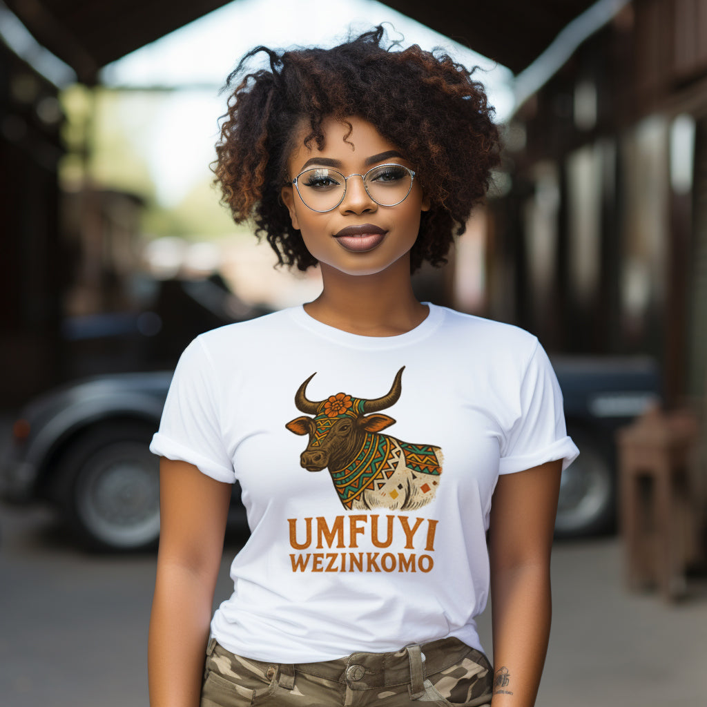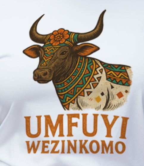 This eye-catching design showcases a noble Nguni cow adorned with vivid tribal beadwork and a symbolic flower crown, representing grace, femininity, and rural royalty. The detailed patterns in earthy oranges and rich teal reflect the harmony of African craftsmanship and tradition. A bold yet elegant tribute to the beauty of heritage and strength.