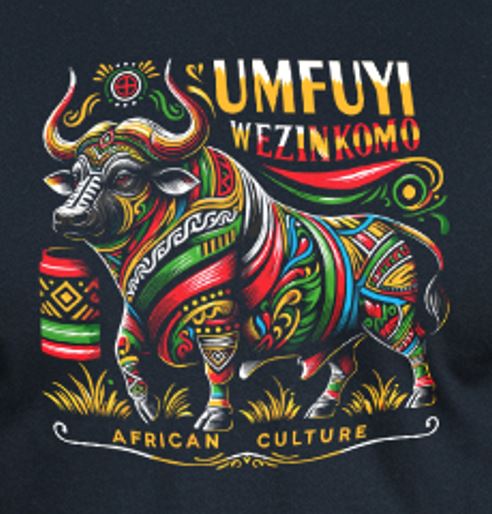 Celebrate the vibrant rhythm of the land with Royal Hide. This long sleeve shirt bursts with bold African patterns and vivid colors across a majestic Nguni bull, standing proud beneath the banner of African culture. A wearable canvas of heritage and pride.