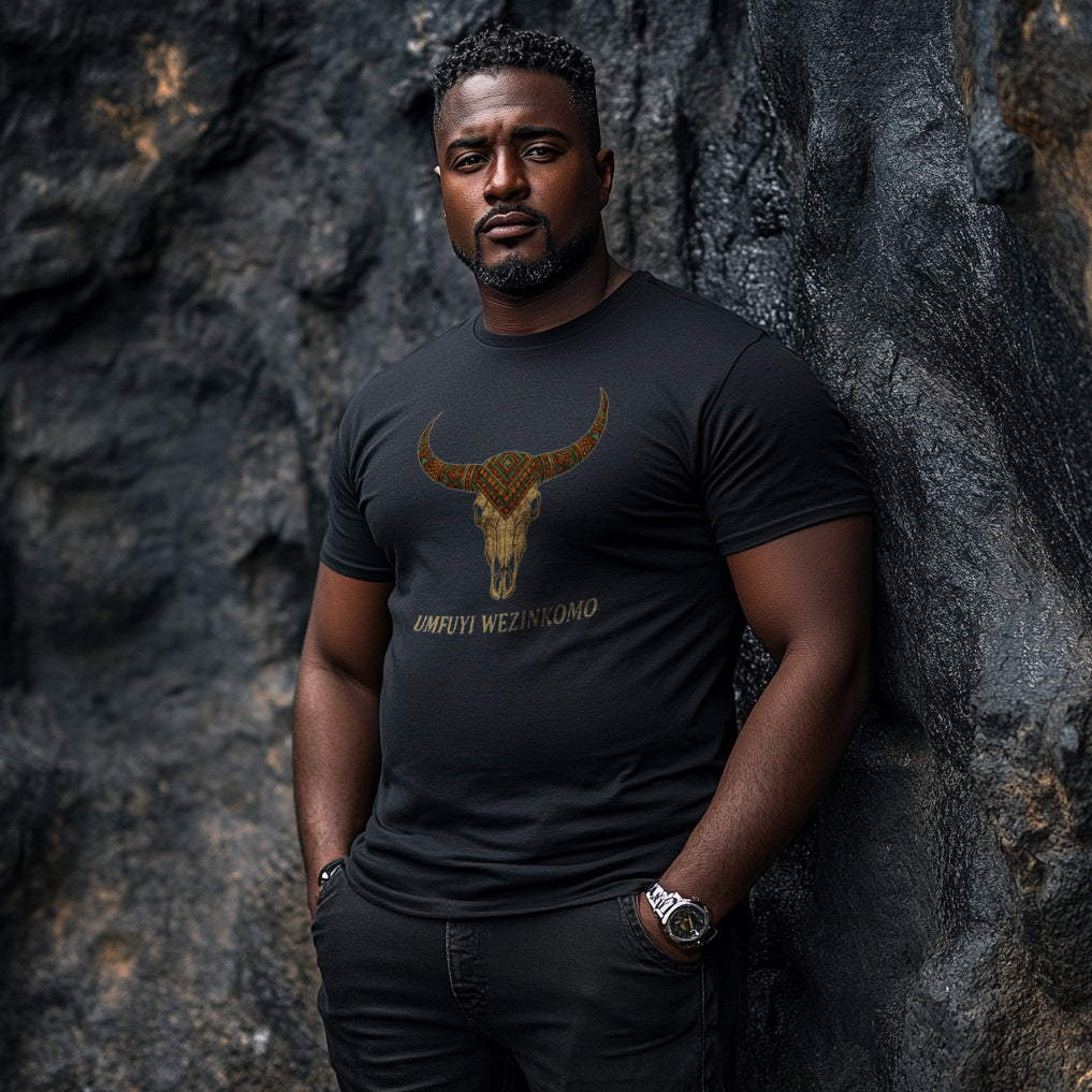 This minimalist yet powerful design features a tribal-decorated Nguni skull with rich African geometric detailing across the horns and forehead. “Sacred Skull” is a tribute to ancestral strength and cultural identity — a bold statement for those who carry heritage on their shoulders. The clean layout and earthy tones make this a timeless staple for any heritage-inspired wardrobe.