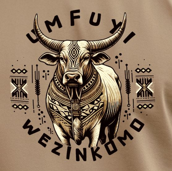 The Decorated Chief is a commanding display of African status and beauty. Featuring a regal Nguni bull adorned with tribal beads, neckwear, and facial markings, this design pays homage to the ceremonial role of cattle in African tradition. Framed with spears and beadwork patterns, it’s a bold fusion of strength, style, and ancestral honor.