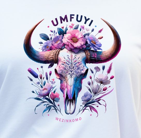Blossom Spirit radiates a magical mix of ancestral strength and feminine energy. A richly decorated Nguni skull is crowned with vivid flowers in pinks, purples, and blues, surrounded by soft florals that seem to bloom from the spirit itself. This design embodies bold self-expression rooted in beauty, tradition, and power — a perfect statement piece for women who wear their culture with color and confidence.