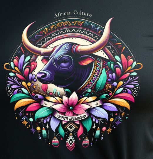 Zulu Bloom Crest showcases a striking Nguni bull framed in an explosion of tribal color and elegance. Wrapped in a crown of petals and geometric patterns, this artwork represents strength, heritage, and celebration of African identity. The vibrant palette pops beautifully on darker fabric, making it a perfect centerpiece for bold expression.